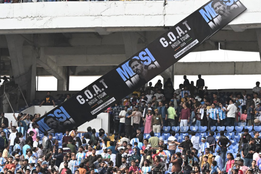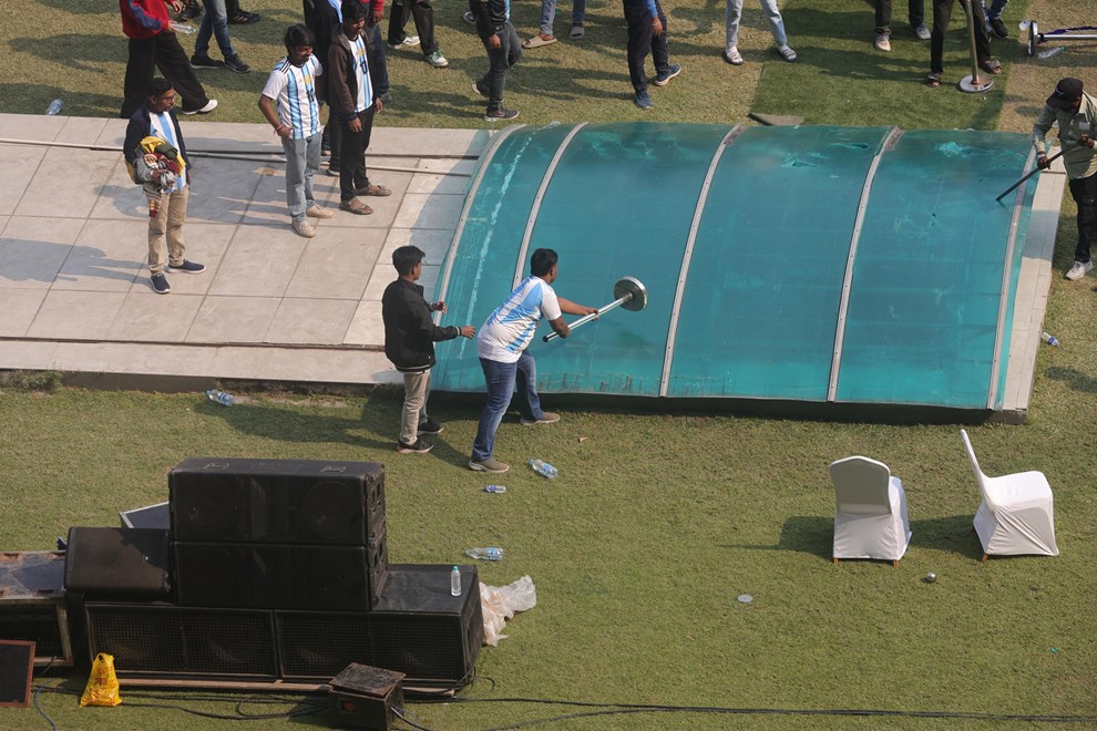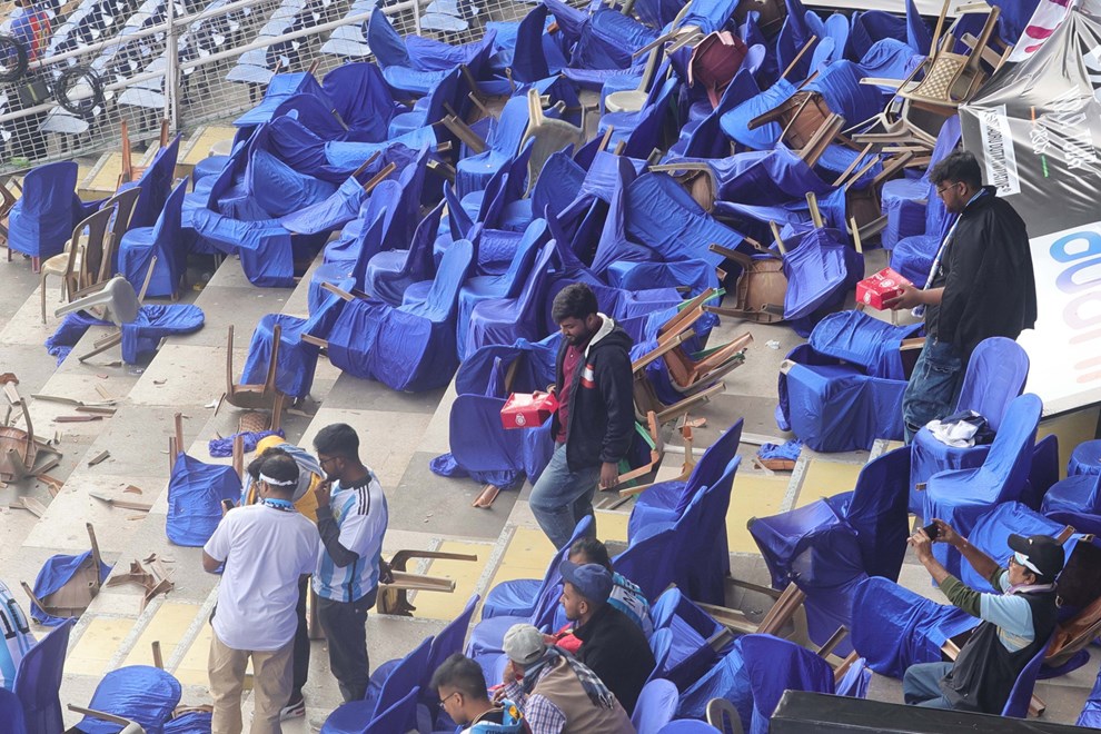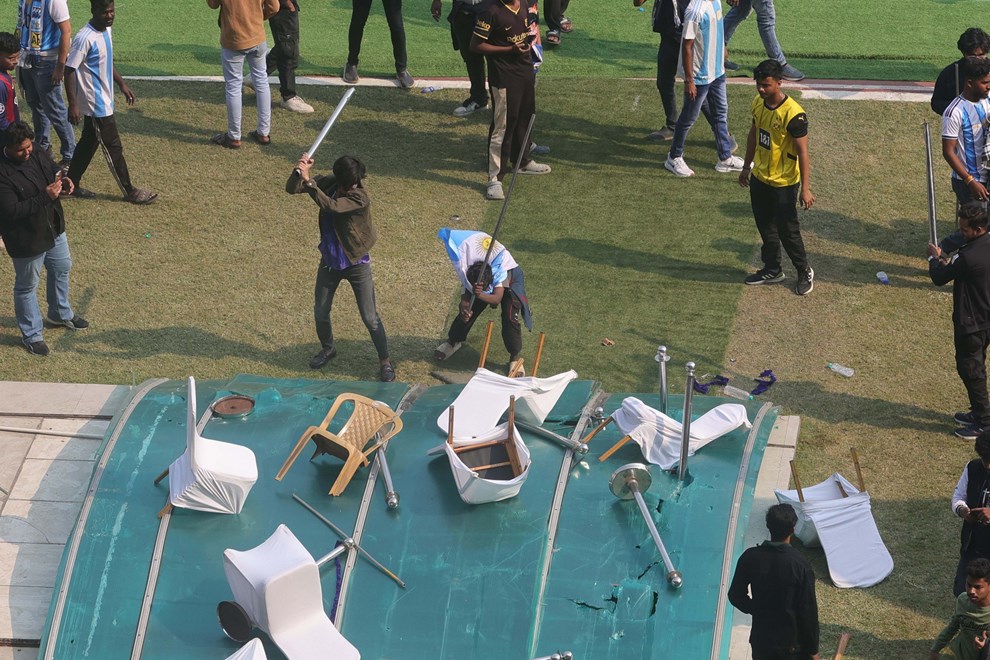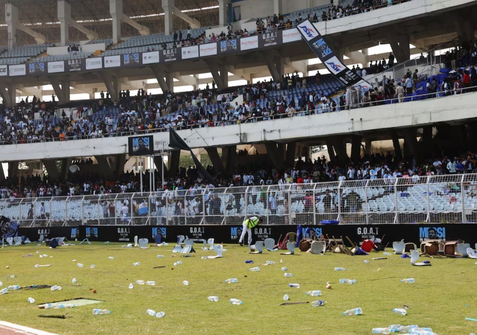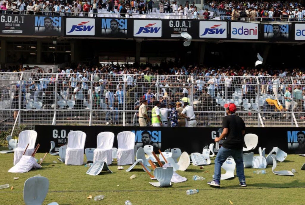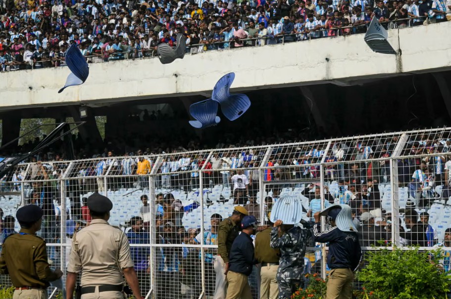 Посетата на Лионел Меси на Индија се претворила во целосен хаос откако илјадници лути обожаватели влетале во теренот на стадионот „Солт Лејк“ во Калкута, фрлајќи шишиња и уништувајќи го инвентарот.