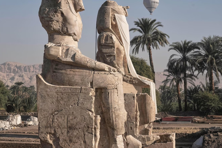 Џиновските статуи од алабастер, познати како колоси на Мемнон, повторно се составени во рамки на проектот за реновирање кој траел околу две децении. Тие го претставуваат Аменхотеп III, кој владеел со антички Египет пред околу 3.400 години.