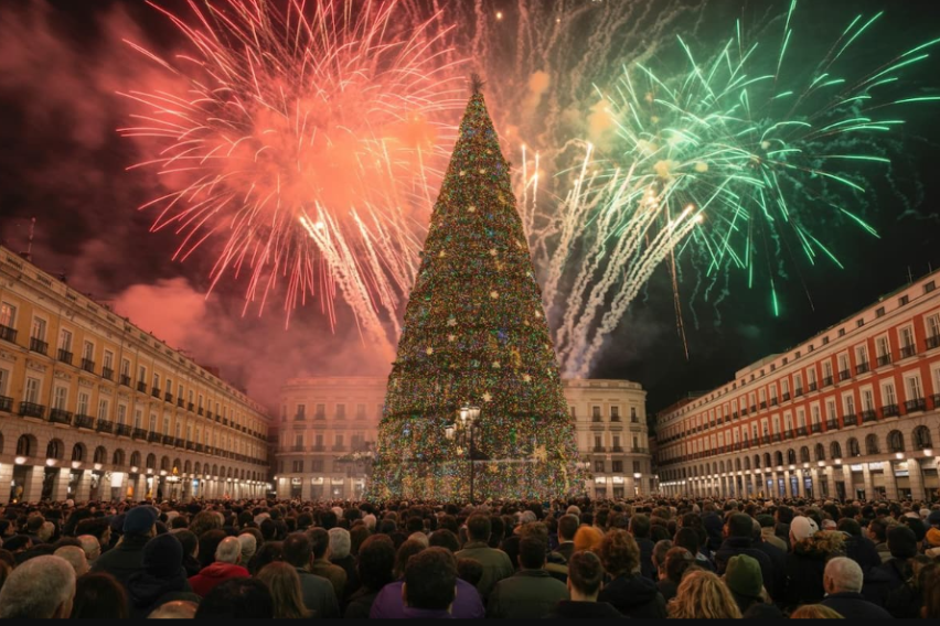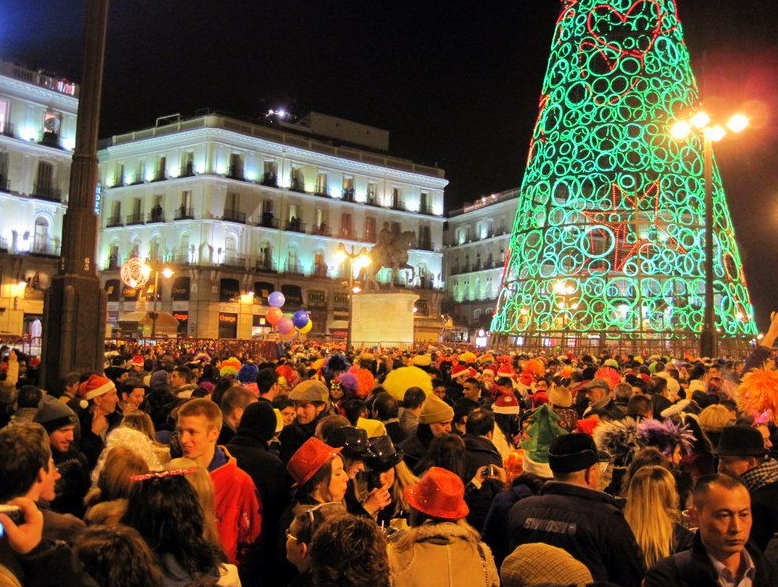 „Las doce uvas de la suerte“, односно 12-те гроздови на среќата, со векови стара шпанска традиција според која се јаде по едно зрно грозје со секое отчукување на часот по полноќ, за среќа во новата година. Многу е потешко отколку што звучи, што е дел од забавата.
