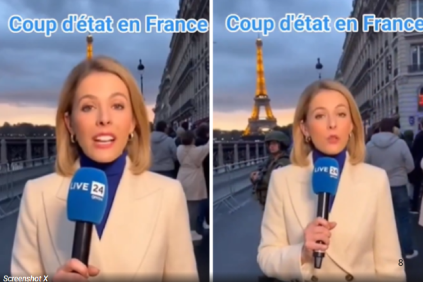 Во спорното видео се гледа хеликоптер, војници, собрана маса луѓе, како и наводна водителка на вести која тврди дека во Франција е извршен државен удар, дека бил предводен од непознат полковник и дека Макрон е соборен од власт. Но, како што набрзо се покажа, видеото е целосно лажно и изработено со помош на вештачка интелигенција.