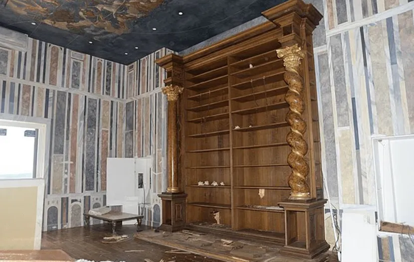 Голема, празна дрвена полица за книги се чини дека останала во добра состојба, иако другите делови од собата изгледале недовршено, пишува „Дејли мејл“.
