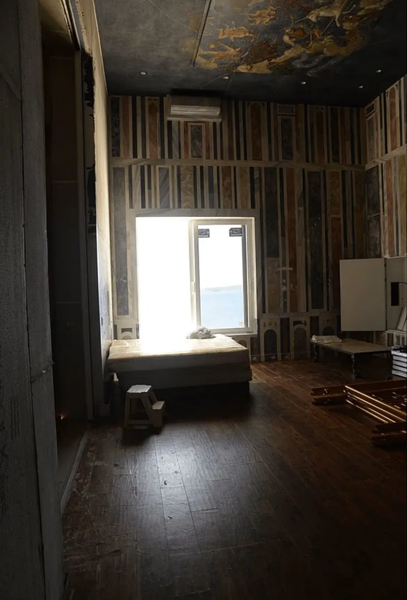 Фотографиите од внатрешноста ја покажуваат зградата во лоша состојба, со вишок дрвени штици расфрлани наоколу и изложени бетонски панели.