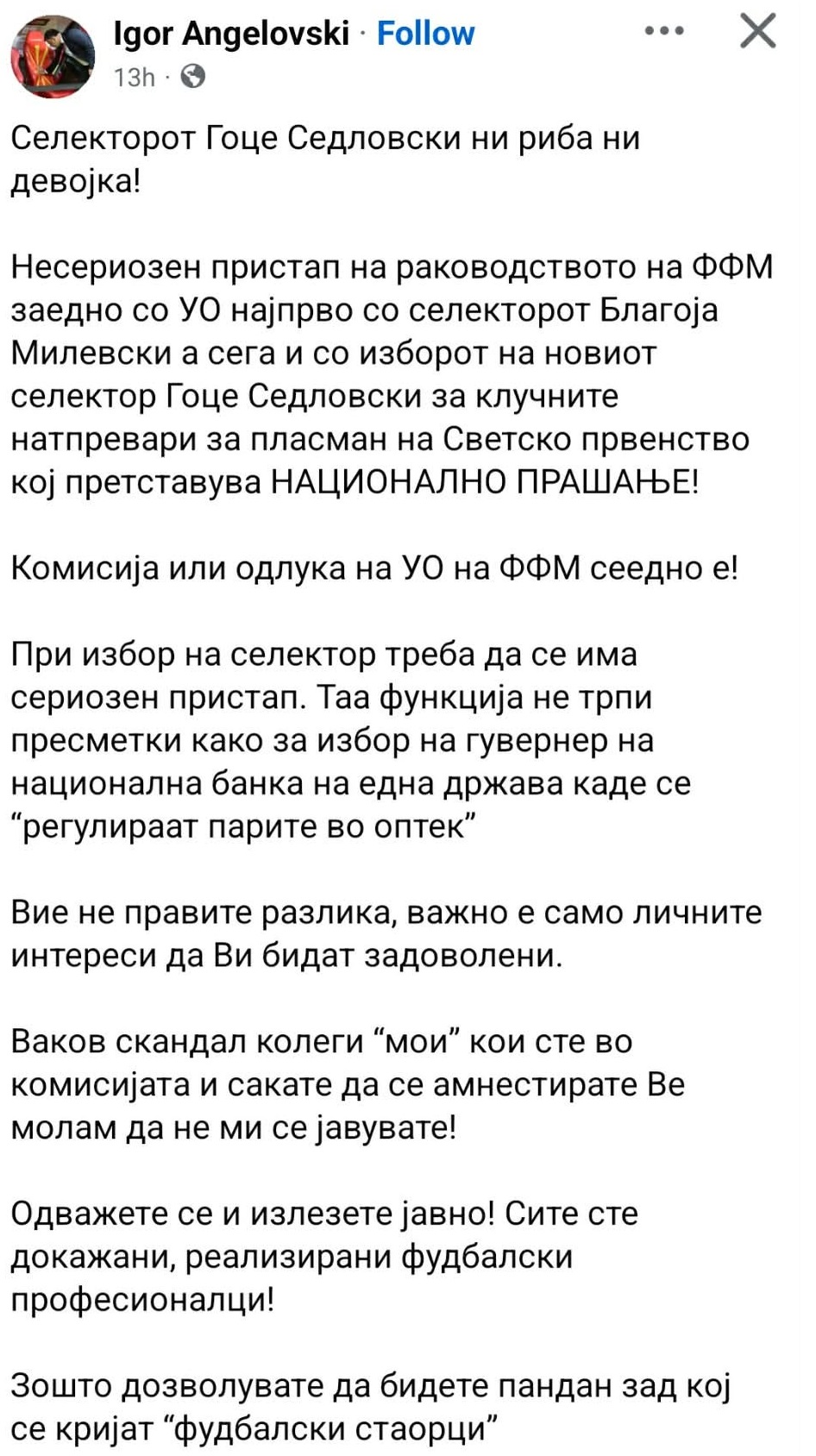 Несериозен пристап на раководството на ФФМ заедно со УО најпрво со селекторот Благоја Милевски, а сега и со изборот на новиот селектор Гоце Седлоски за клучните натпревари за пласман на Светско првенство кој претставува национално прашање!