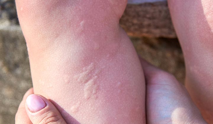 Како што објаснила Еванс, главниот симптом е кожен осип кој може да се манифестира како копривница (уртикарија), испакнатини или плускавци, а честопати проследено со исклучително чешање, црвенло и отеченост. Други симптоми вклучуваат замор, треска, болки во зглобовите и главоболки, додека лицата со потежок облик можат да искусат срцебиење, недостиг на воздух и несвестица.