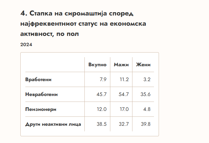 Според најфреквентниот статус на економска активност, стапката на сиромашни вработени лица изнесувала 7,9 отсто, а кај пензионерите 12,0 отсто. Кај невработените лица, стапката на сиромаштија изнесувала 45,7 отсто.
