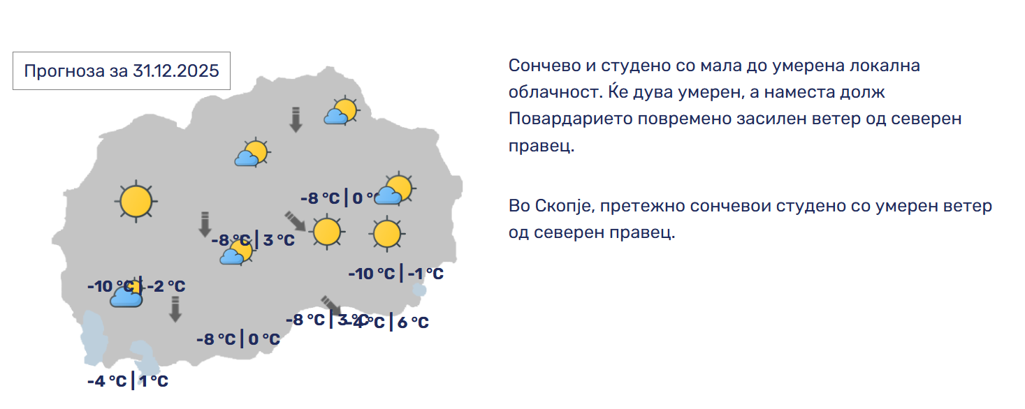 Времето утре ќе биде сончево и студено, со мала до умерена локална облачност. Ќе дува умерен ветер, а долж Повардарието повремено засилен ветер од северен правец.