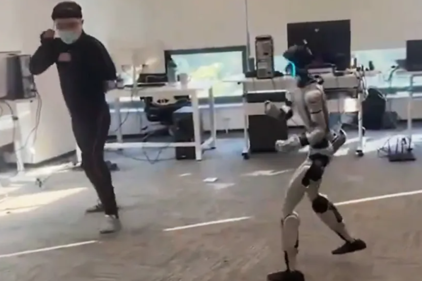 На виралната снимка се гледа моментот кога „Unitree G1“, следејќи ги движењата на човек облечен во одело со сензори, изведува силен удар – директно во неговите препони!