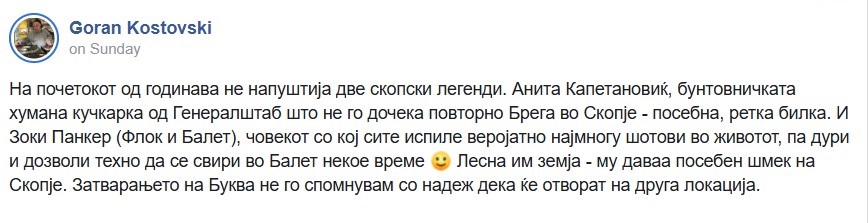 Лесна им земја - му даваа посебен шмек на Скопје. Затварањето на Буква не го спомнувам со надеж дека ќе отворат на друга локација“, напиша Горан Костовски.