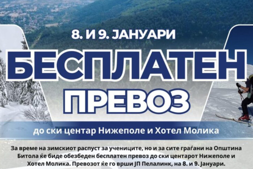„На 8 и 9 јануари ( четврток и петок ) бесплатно можете да одите до ски центрите кај Нижеполе и кај хотелот „Молика“ и да уживате во убавините на планината“, велат од Општината.