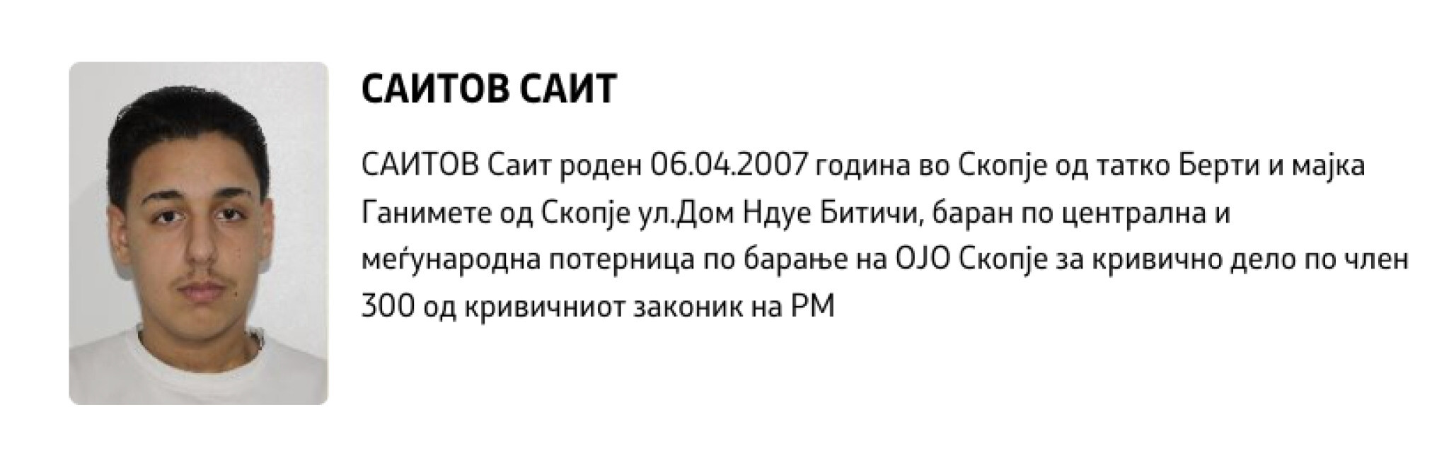 МВР сега го објави неговиот идентитет – станува збор за Саит Саитов роден на 6-ти април 2007 година во Скопје, од татко Берти и мајка Ганимете. „Лицето е барано по централна и меѓународна потерница по барање на ОЈО Скопје за кривично дело по член 300 од Кривичниот законик“, пишува во полициската потерница.