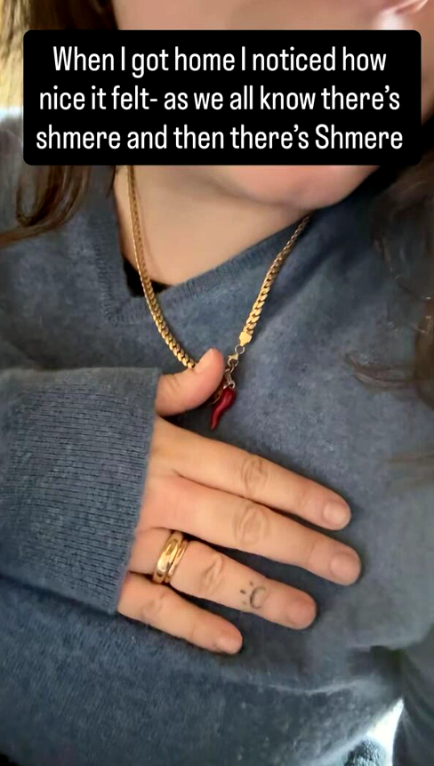 „Апсолутно немам намера да го продадам. Ќе го чувам засекогаш – и ако некогаш се истроши, ќе го зачувам на парчиња како спомен. Но, искрено, вака добар кашмир веројатно ќе трае со години“, заклучила таа.