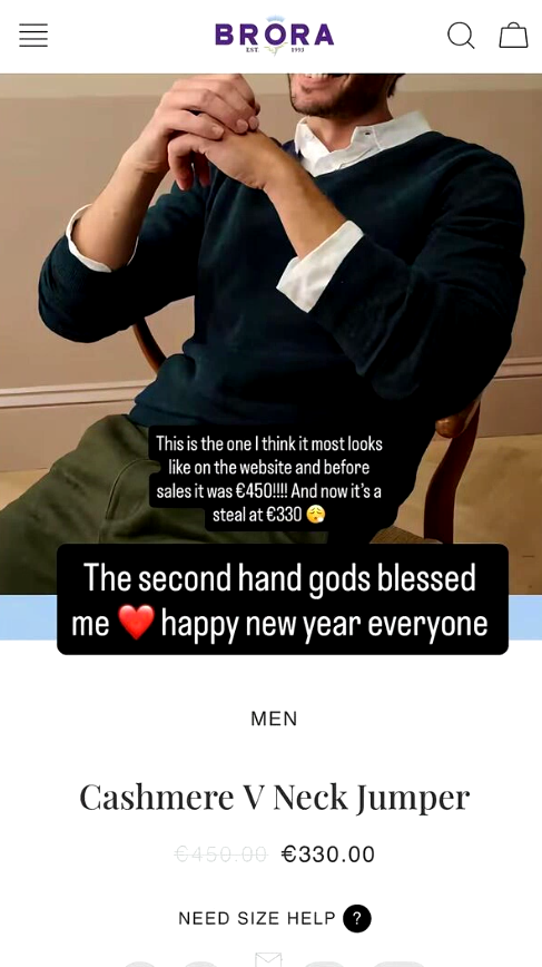 „Всушност, ја погледнав етикетата дури кога се вратив дома и коментирав со татко ми колку е квалитетен џемперот“, рекла таа. На етикетата пишувало „Брора“, па таа го побарала брендот на Гугл и открила дека нов, сличен модел се продава за околу 330 евра.