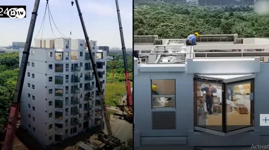 Видеото кое кружи на социјалните мрежи во последните денови прикажува десеткатна зграда изградена за само 28 часа и 45 минути благодарение на систем од готови модули кои се поставуваат со кранови на градилиштето.