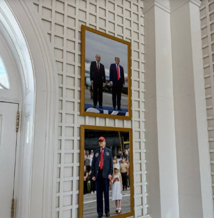 Новинарката на Би-Би-Си, Елизабет Ландерс, објави на социјалната мрежа Икс заедничка фотографија од Трамп и Путин од самитот во Алјаска, наведувајќи дека се наоѓа во ходник што го поврзува западното крило на Белата куќа со резиденцијата на американскиот претседател. На фотографијата, Путин и Трамп се прикажани како стојат еден до друг за време на официјално фотографирање, додека под неа е друга врамена слика од Трамп како ја држи раката на неговата внука.