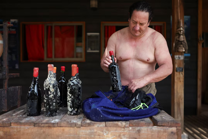 Во кафези поставени на морското дно околу малиот остров Локос, во северниот дел на Чиле, нуркачи спуштаат шишиња вино како дел од иновативен проект за зреење вино под вода.