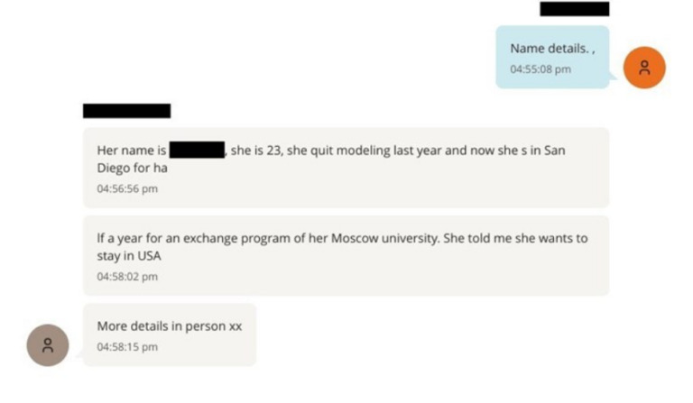 Во разговор што се одвивал во текот на два дена преку iMessage услугата на Apple, неидентификуваното лице (чиј идентитет и телефонски број се затемнети) споменува жена опишана како 23-годишна поранешна манекенка од Русија.