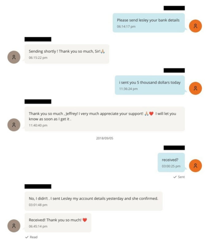 Потоа Епстин бара банкарски податоци од третото лице, а во порака испратена пет часа подоцна, тој вели: „Денес ти испратив 5.000 долари“. Следниот ден, тој проверува дали парите се депонирани.