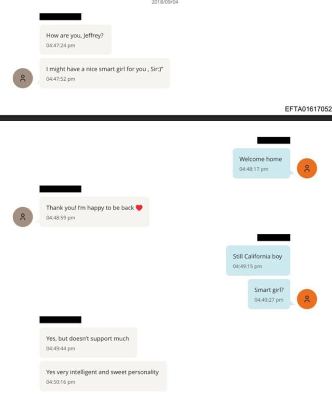 Лицето му се обраќа на Епстин со „Џефри“ и пишува: „Можеби имам убава, паметна девојка за вас, господине“, на што Епстин одговара со прашањето: „Паметна девојка?“