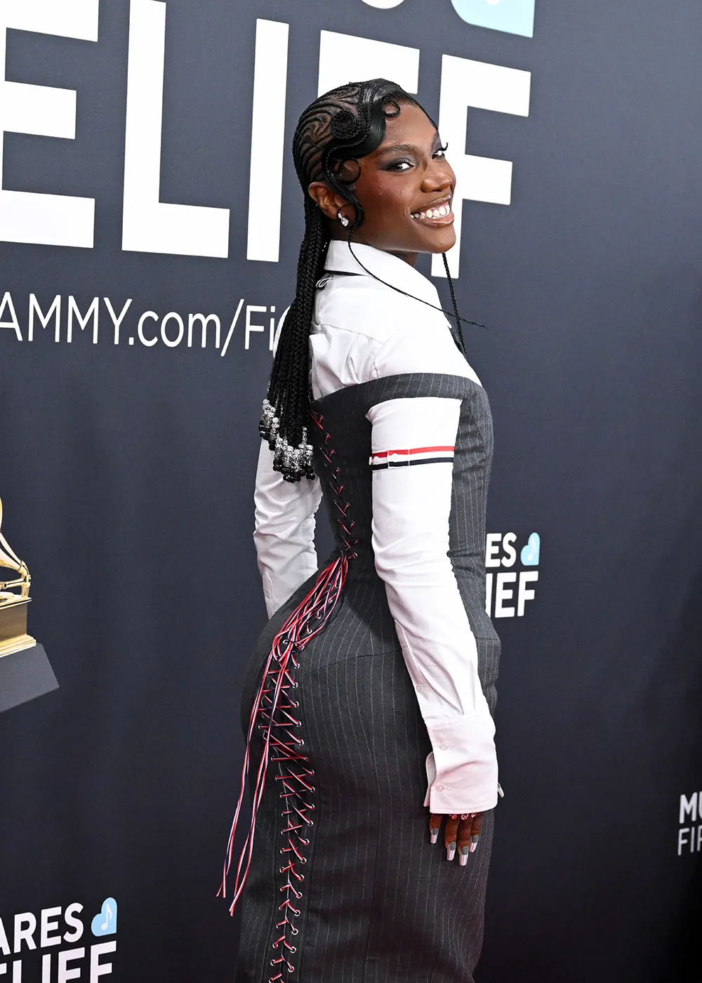 Ова е трето појавување на раперката на доделувањето на Греми наградите. Деби настапот го имаше во 2022 година, а се врати и минатата година, кога оствари забележителен настап и ја освои наградата за најдобар рап албум. Тогаш носеше сив фустан со пруги од „Tom Browne“ преку бела кошула, а комбинацијата ја надополни со мокасини со платформа.