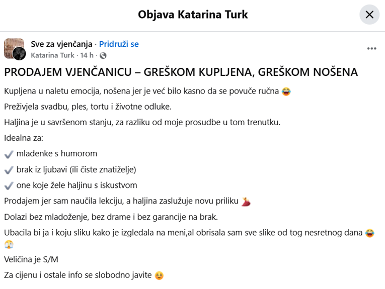 [ФОТО] Хит оглас на Хрватка кој го освои регионот: „Продавам венчаница. По грешка купена, по грешка носена“