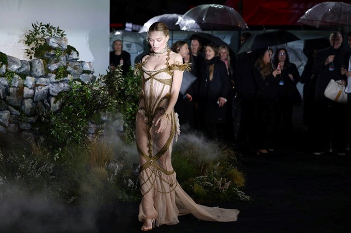 По низа смели „историски“ стајлинзи за време на промотивната турнеја, Роби и овојпат успеа да ги надмине очекувањата. Актерката, која во новата адаптација ја толкува Кетрин Ерншо, за лондонската премиера одбра смел проѕирен фустан од лондонската дизајнерка Дилара Финдикоглу. Креацијата беше изградена околу корсет во викторијански стил, а дополнително внимание привлече поради зелените детали изработени од – исплетена коса.
