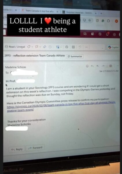 Канадската спортиска во уметничко лизгање, Маделин Шизас, која настапува на Зимските олимписки игри во Милано и Кортина, побарала од професорот по социологија да ѝ го продолжи рокот за домашна задача – со „најдобрата можно изговор“: „На Олимпијада сум!“