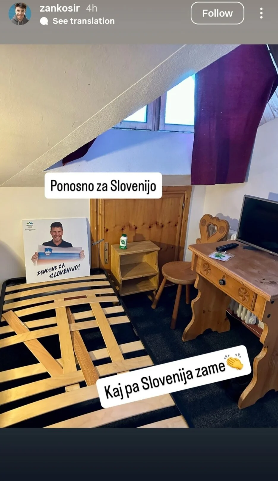 Сега реши да покаже како изгледа „шталата“, па покрај фотографијата од своето сместување напиша: „Горд сум на Словенија, дали е Словенија горда на мене?“.