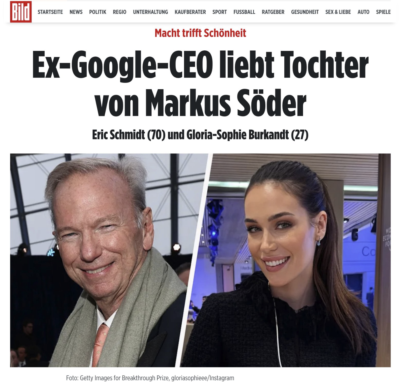 Германскиот „Билд“ тврди дека 70-годишниот милијардер и поранешен извршен директор на компанијата „Гугл“, Ерик Шмит има љубовна афера со 27 годишната манекенка и ќерка на баварскиот премиер, Глорија Софи Буркхард.