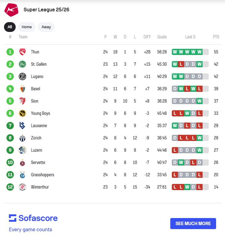 Со вкупно 55 бода клубот од Берн е на врвот на табелата со 13 поени повеќе од второпласираниот Ст. Гален.