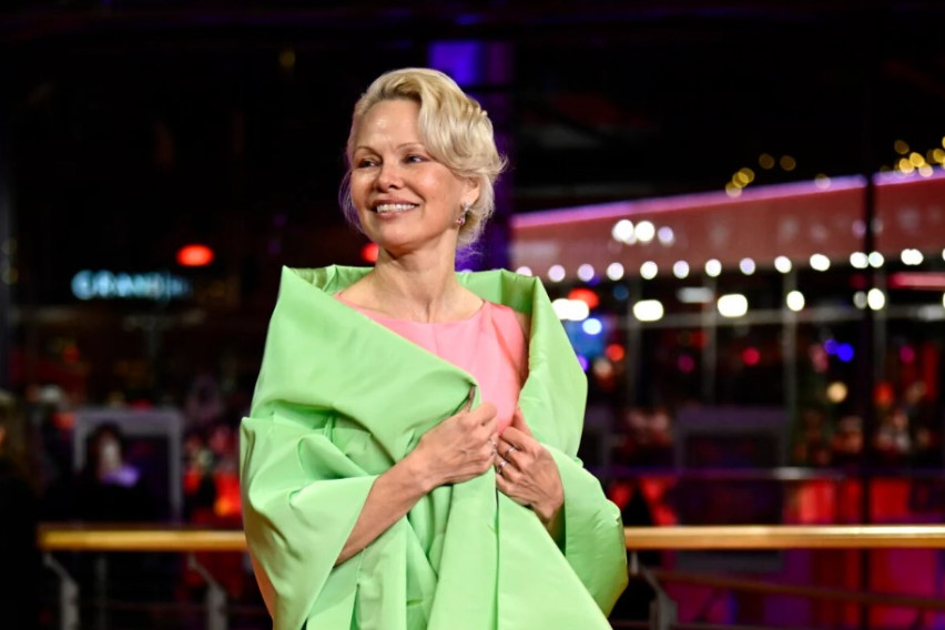 Памела Андерсон донесе боја на црвениот тепих на Берлинале каде прошета во комбинација од розова и пастелно зелена боја, и тоа на премиерата на филмот „Rosebush Pruning“.