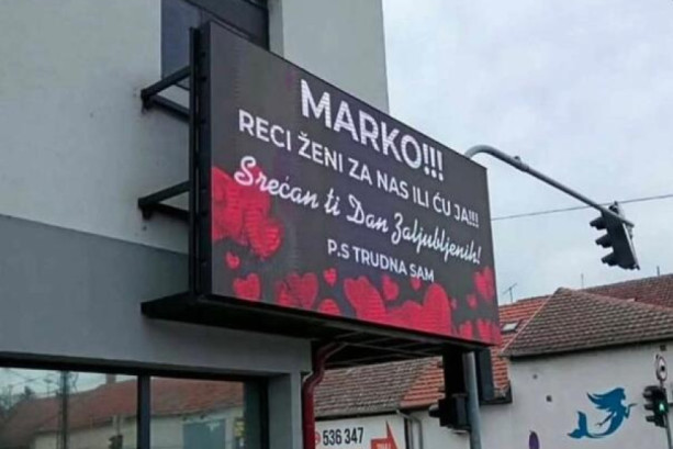 На аголот од улиците Змај Јовина и Скадарска осамна билборд со порака што предизвика бројни реакции. Со илустрации од црвени срца, на големиот екран стоеше натпис упатен до извесен Марко, во кој од него се бара да ѝ признае на сопругата наводна врска, со дополнување дека испраќачката на пораката – е бремена.