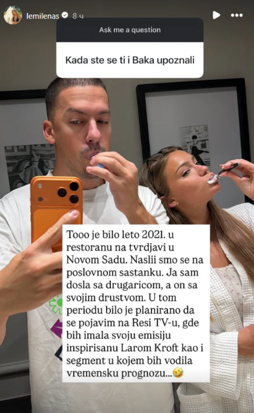 „Тоа беше летото 2021 година во ресторан на тврдината во Нови Сад. Се сретнавме на деловен состанок. Јас дојдов со мојот пријател, тој со неговото друштво. Во тој период беше планирано да се појавам на телевизијата Реша, каде што ќе ја имам мојата емисија инспирирана од Лара Крофт, како и сегмент во кој ќе ја водам временската прогноза“, напишала таа на Инстаграм, а кога ја прашале дали ѝ е тешко да се приспособи на неговиот начин на живот, искрено додала: