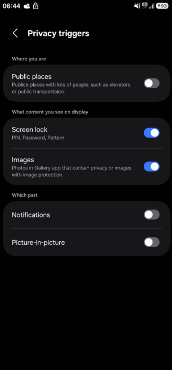 Во видеото е прикажан случај во кој целиот екран се затемнува за несакани набљудувачи кога е вклучена опцијата „Zero-peeking privacy“. Интересно е што телефонот има контрола поединечно врз пикселите, па може да затемни само известувања со чувствителни информации.