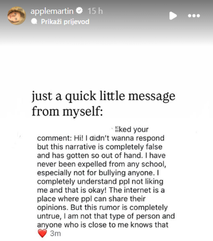 „Здраво! Не планирав да се огласувам, но оваа приказна е целосно лажна и излезе од контрола. Никогаш не сум исфрлена од ниту едно училиште, а особено не поради злоставување на било кого. Целосно разбирам дека некои луѓе можеби не ме сакаат и тоа е во ред! Интернет е место каде луѓето можат да ги изнесуваат своите мислења. Но, оваа гласина е апсолутно неточна. Јас не сум таква личност и секој кој ме познава тоа го знае“, напиша таа на Инстаграм.
