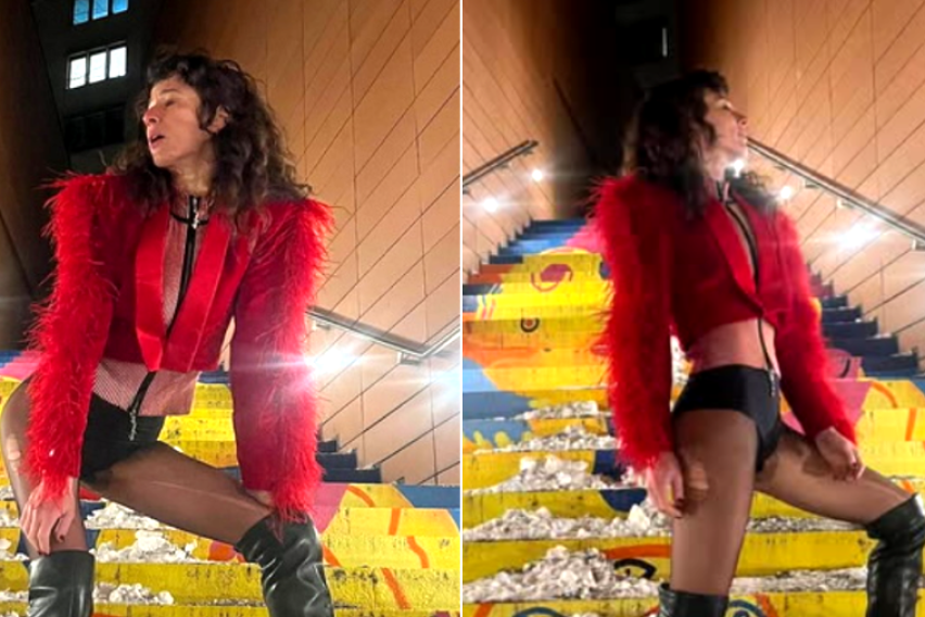 Актерката блеска во смела креација на македонскиот дизајнер Марков – боди со стилизирано црвено палто и високи чизми до над колена, па се чини дека снегот во Берлин не бил пречка таа да прошета облечена во таква креација.