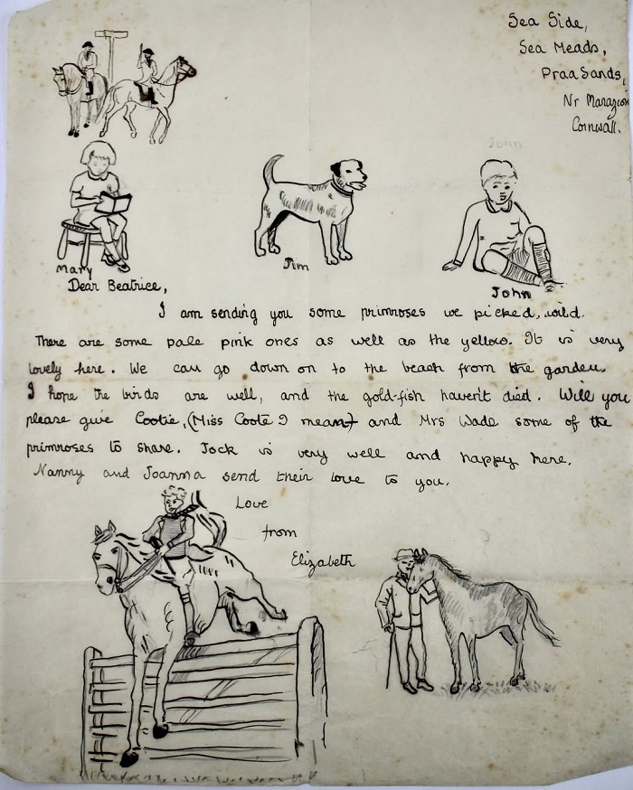 Писмото адресирано до Беатрис Стилман, главна домаќинка во Кралската ложа во Виндзор, содржи цртежи од кучиња, коњи и деца, како и прашање дали „птиците се добро и дали златните рипки не умреле“, објавува Би-би-си.