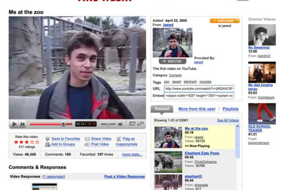 Дваесет и петгодишниот Џавед Карим, еден од коосновачите на „YouTube“, стои пред живеалиштето на слоновите во зоолошката градина во Сан Диего. Во слабата резолуција на тогашните дигитални камери, несмасно кадриран, ја изговара реченицата што ќе влезе во историјата: „Супер работа кај овие типови е тоа што имаат навистина, навистина, навистина долги сурли. И тоа е отприлика сè што има да се каже.“ Тие деветнаесет секунди, објавени на 23 април 2005 година под наслов „Me at the zoo“, станаа темел на интернет-револуцијата. Видеото, кое денес има повеќе од 382 милиони прегледи и над осумнаесет милиони лајкови, го означи раѓањето на нова ера. Речиси две децении подоцна, тој исечок стана толку значаен што доби место во една од најпрестижните светски културни институции.