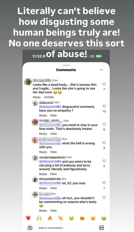 „Не можам да поверувам колку се некои човечки суштества одвратни. Никој не заслужува вакво злоставување“, наведе Озборн покрај фотографијата со коментари во кои се наведува дека е преслаба и кревка.
