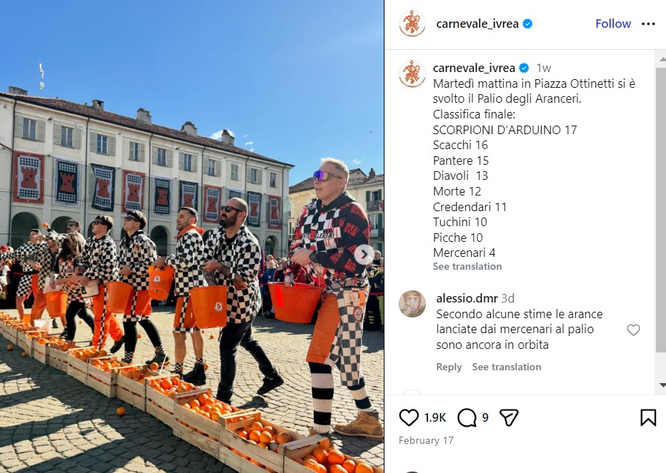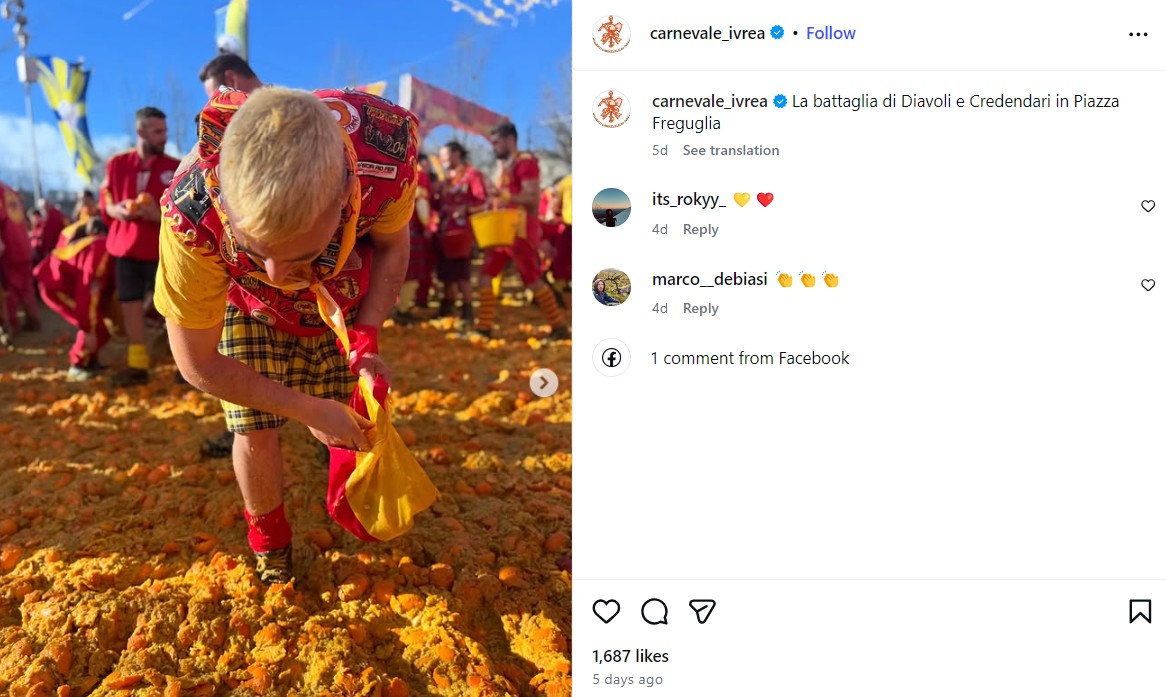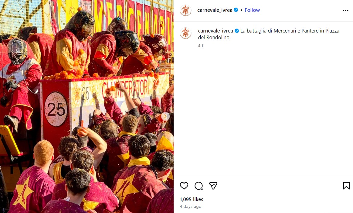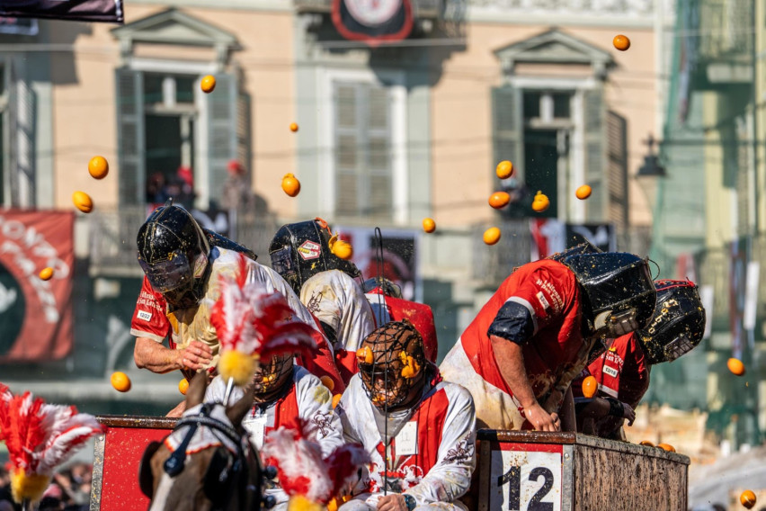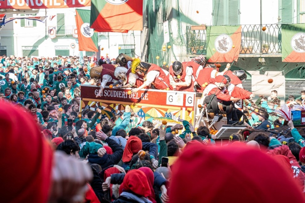 Овој уникатен настан, кој се одржува во средновековниот град Ивреа, во близина на Торино, ја слави легендата за Виолета, ќерката на мелничарот, која го ослободила народот од суровиот тиранин.