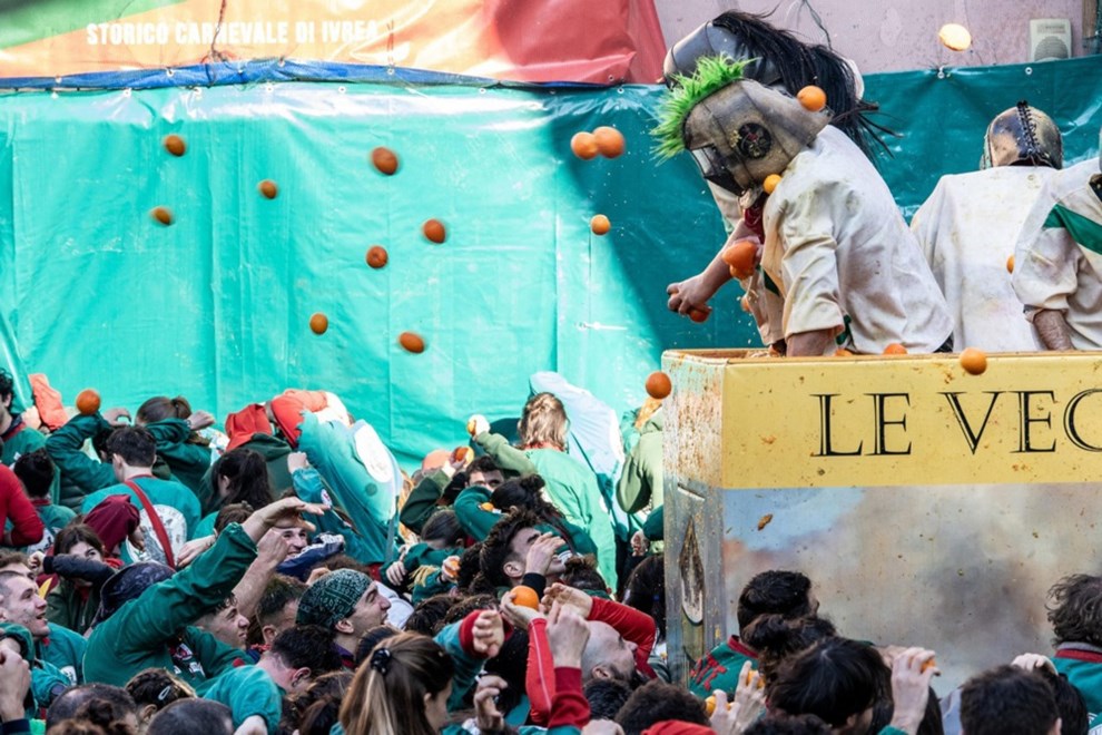 Илјадници луѓе се собрале минатата недела во северноиталијанскиот град Ивреа за да учествуваат во годишната „Битка со портокали“, спектакуларна тридневна карневалска традиција што го оживува историскиот бунт преку фрлање тони портокали, пренесе „Јуроњуз“.