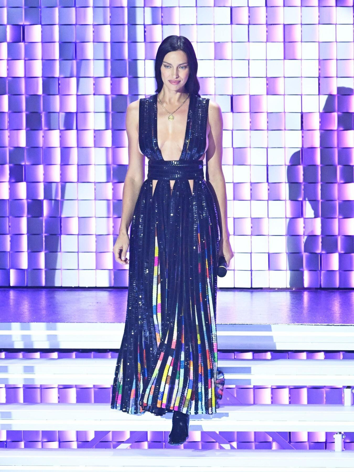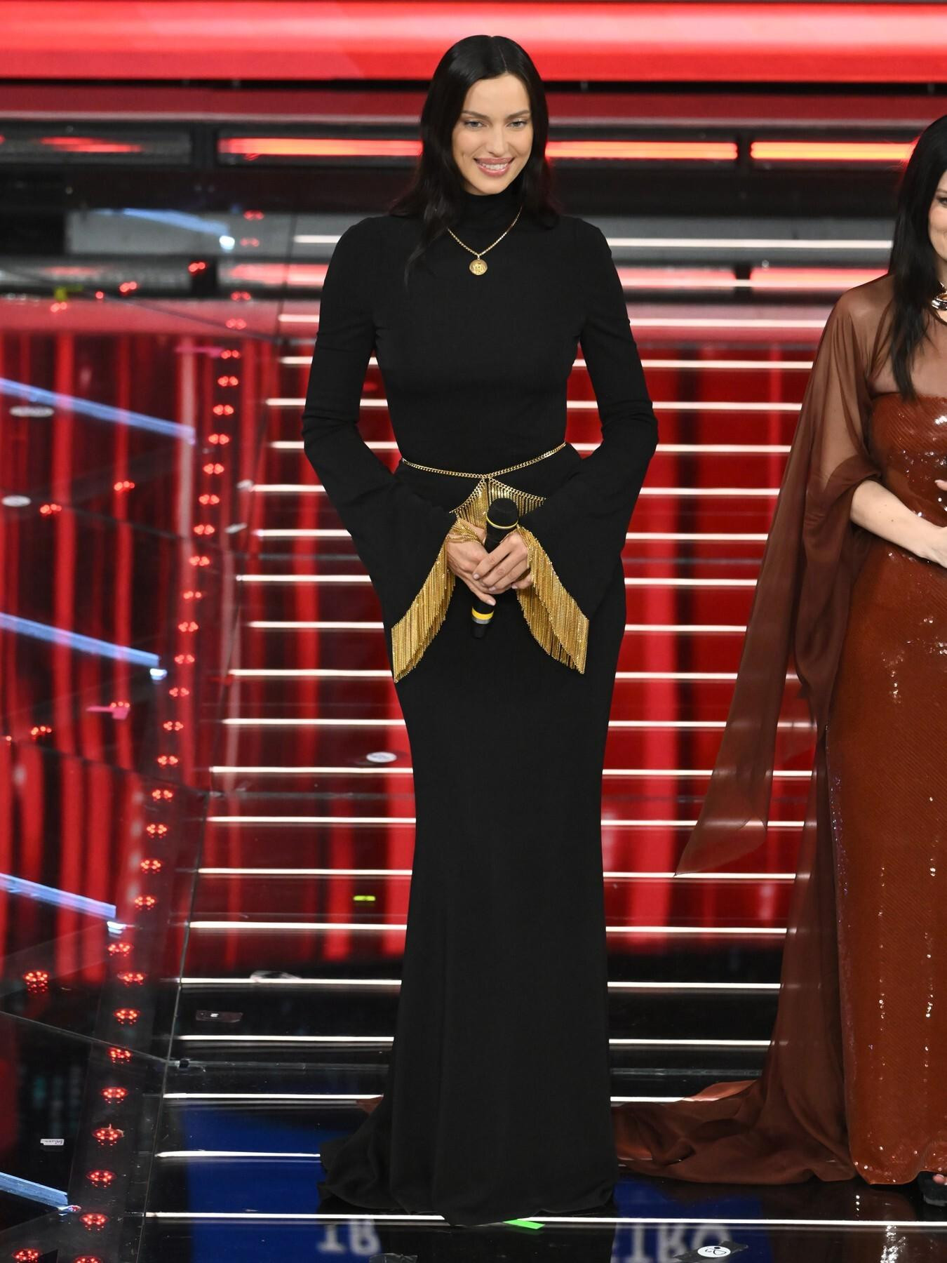 На Музичкиот фестивал во Санремо, Ирина Шајк блесна во црни креации на Рикардо Тиши, внесувајќи софистицираност и театралност на сцената.
