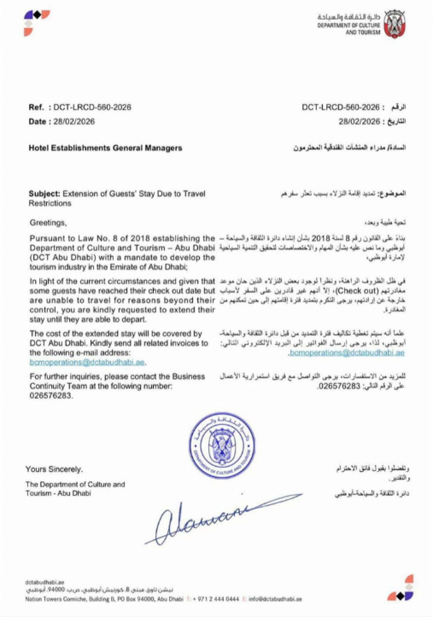 Министерството за култура и туризам им наложи на хотелите во Абу Даби да го продолжат престојот на гостите, бидејќи многу од оние што го завршуваат својот престој не се во можност да патуваат во сегашните околности.