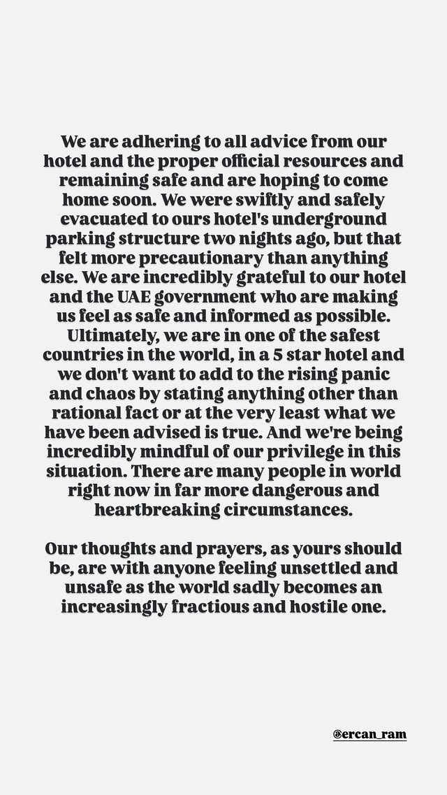 „Ги следиме сите совети од нашиот хотел и од надлежните официјални извори, безбедни сме и се надеваме дека наскоро ќе се вратиме дома“, напиша таа. Додаде дека пред две ноќи брзо и безбедно биле евакуирани во подземната гаража на хотелот, но дека целата ситуација, според нејзиното доживување, повеќе наликувала на мерка на претпазливост отколку на непосредна реална опасност.