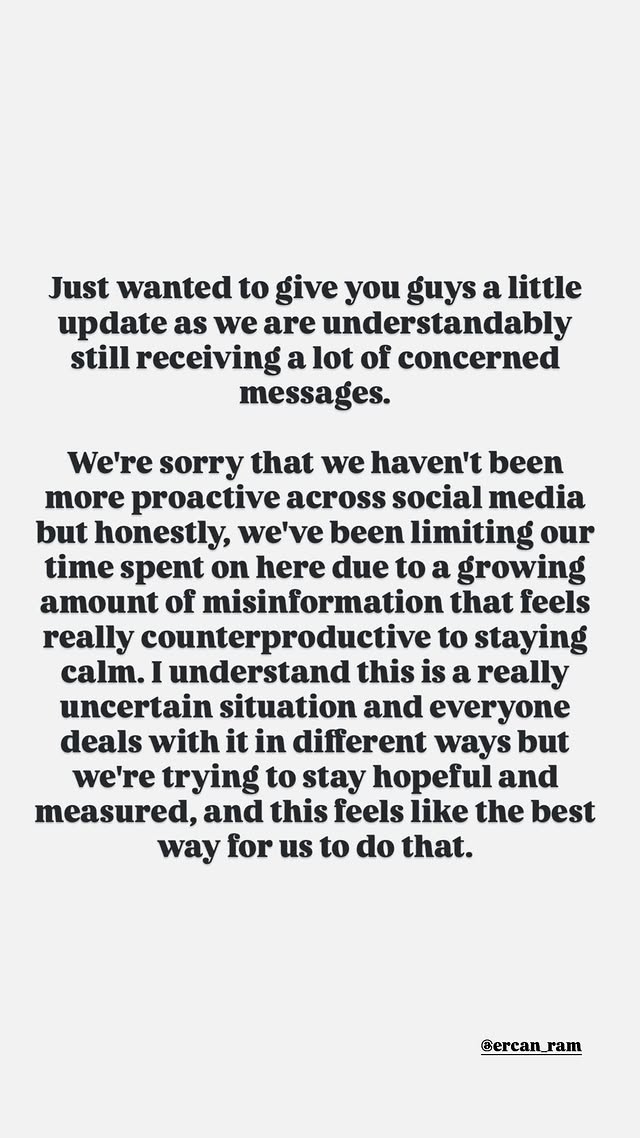 „Не сакам да поттикнувам растечка паника и хаос изнесувајќи нешто друго освен рационални факти, или барем она што нѝ беше кажано дека е вистина“, порача и истакна дека е свесна за сопствената привилегирана позиција. „Исклучително сме свесни за нашата привилегирана положба во оваа ситуација. Во моментов во светот има многу луѓе во далеку поопасни и потресни околности“, напиша таа.