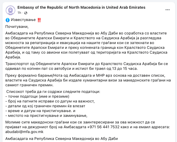 Амбасадата на Република Северна Македонија во Абу Даби, во соработка со властите на Обединетите Арапски Емирати (ОАЕ) и Кралството Саудиска Арабија, ја разгледува можноста за репатриација на и евакуација на македонските граѓани затекнати во овој регион.