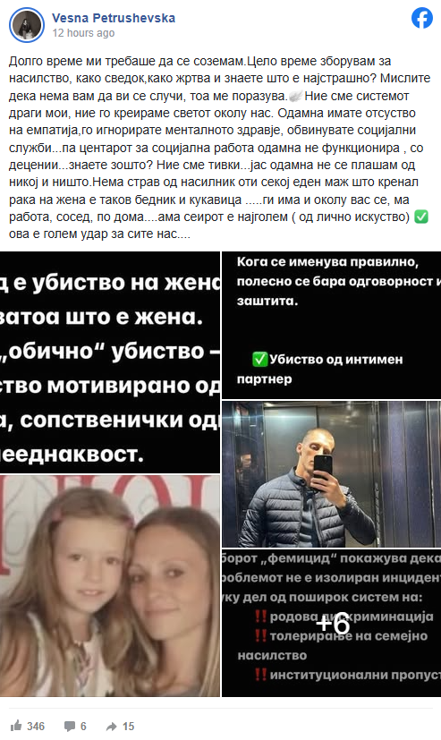 „Долго време ми требаше да се соземам. Цело време зборувам за насилство – како сведок, како жртва – и знаете што е најстрашно? Мислите дека нема вам да ви се случи, тоа ме поразува. Ние сме системот, драги мои, ние го креираме светот околу нас. Одамна имате отсуство на емпатија, го игнорирате менталното здравје, обвинувате социјални служби… па центарот за социјална работа одамна не функционира, со децении. Знаете зошто? Ние сме тивки. Јас одамна не се плашам од никој и ништо. Нема страв од насилник, оти секој еден маж што кренал рака на жена е таков бедник и кукавица. Ги има и околу вас – на работа, во соседството, дома… ама сеирот е најголем. Ова е голем удар за сите нас.“