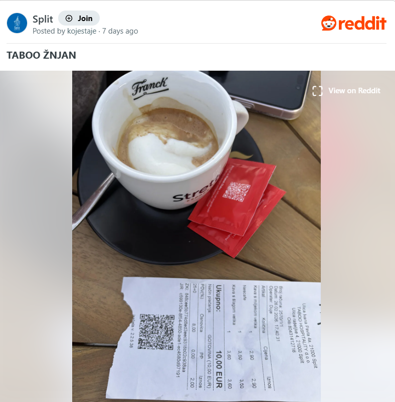 Еден далматинец се изненадил по посетата на кафуле во Сплит, а своето искуство одлучил да го сподели на „Редит“.