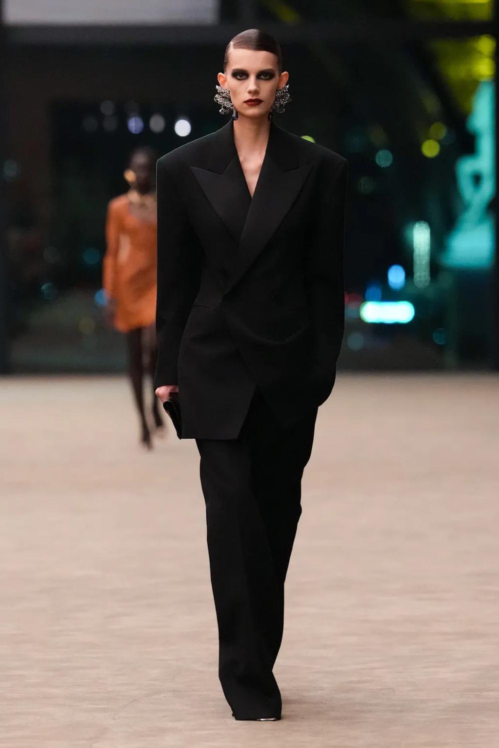 Ревијата беше отворена со низа црни одела со големи ревери и нараменици, потсетувајќи на смокинг за жени кој францускиот дизајнер Ив Сен Лоран го креираше во 1966 година, прекинувајќи ја дотогашната традиција.