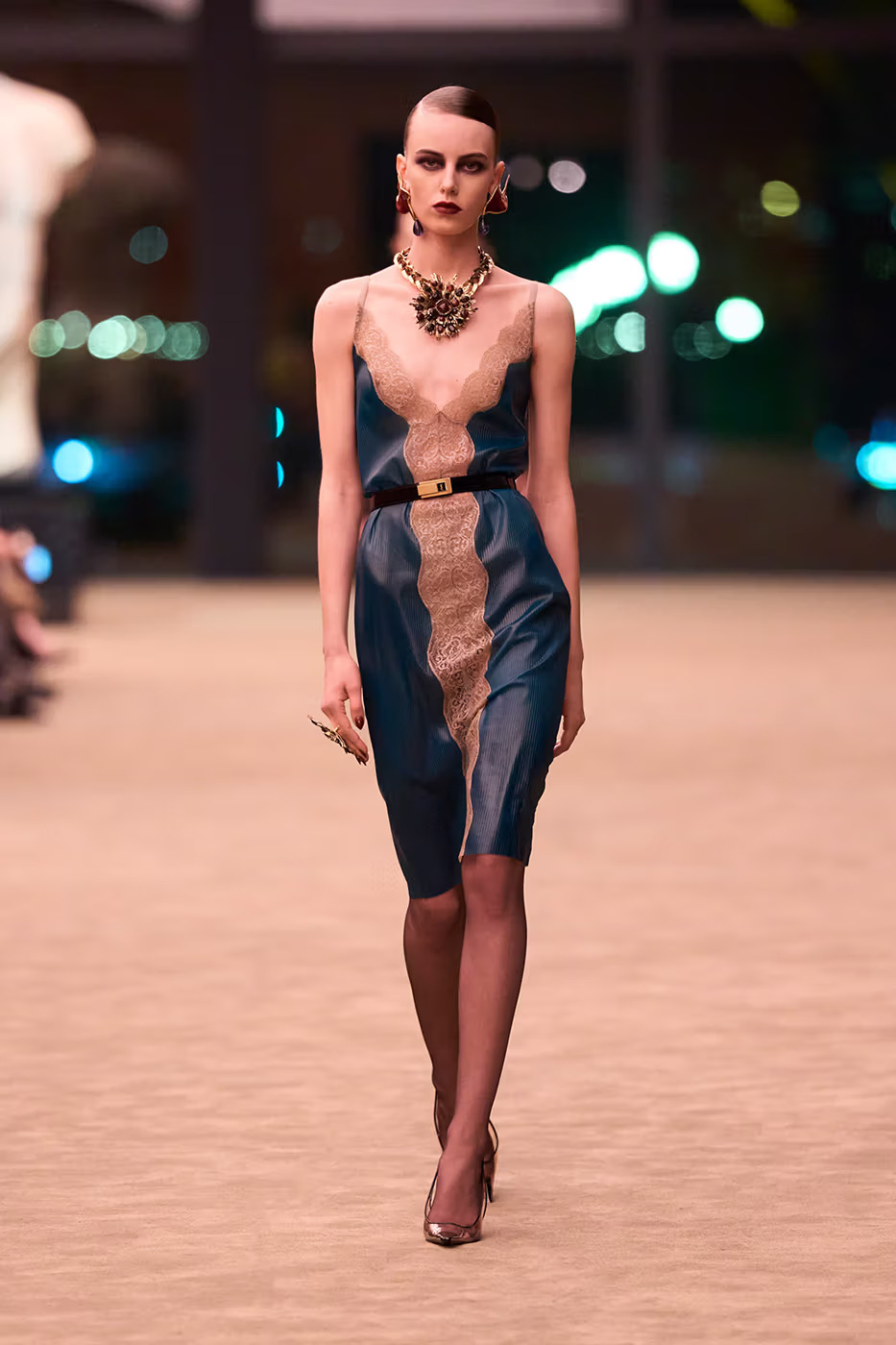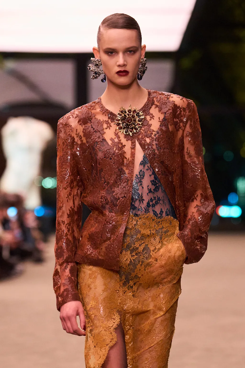 Проѕирни чипкани фустани и здолништа во земјени тонови на црвена, портокалова и кафеава боја беа комбинирани со огромни крзнени палта или избалансирани со масивен накит.