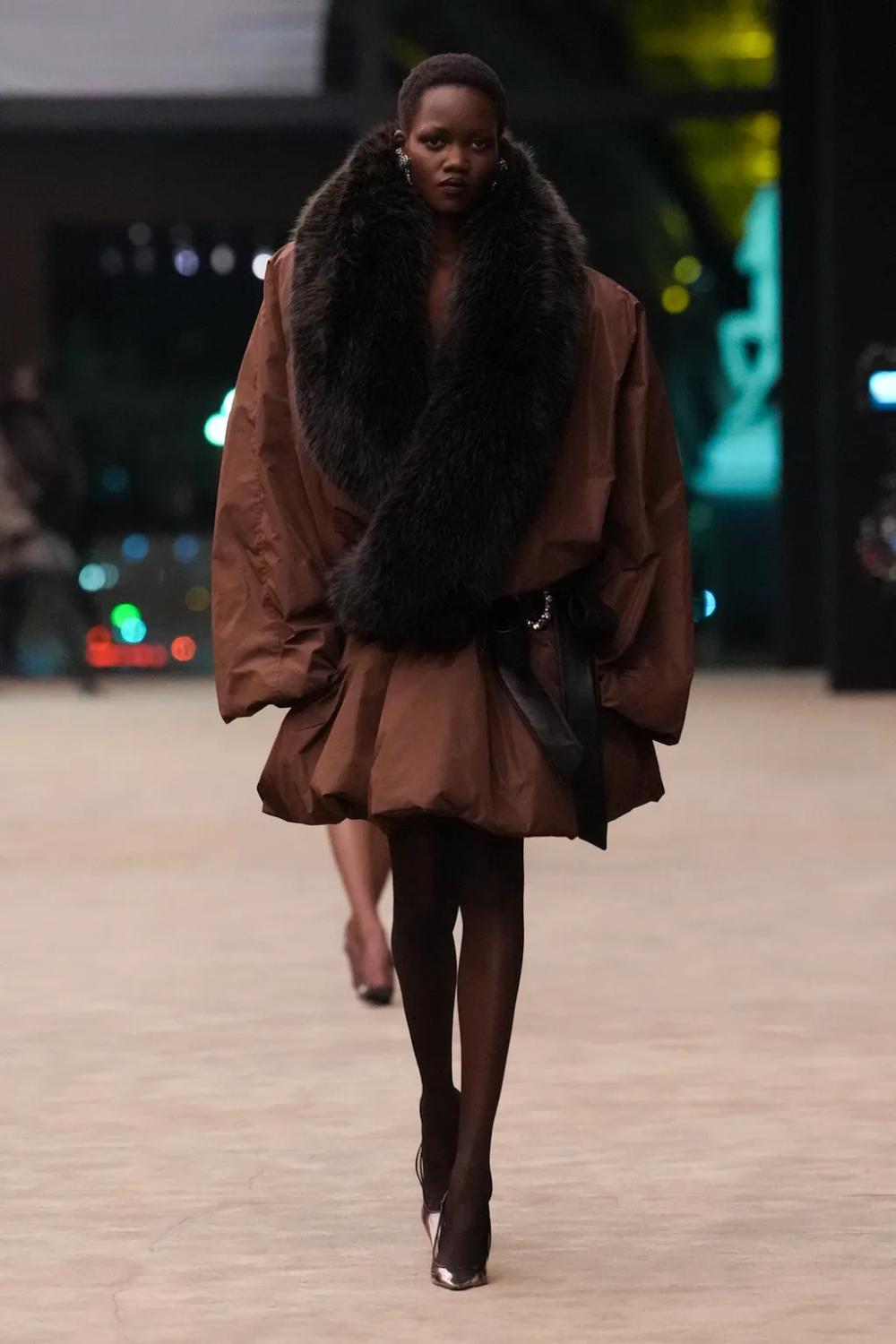 „Saint Laurent“ на Неделата на модата во Париз претстави контрастна колекција од предимензионирани одела и нежни чипкани фустани за својата зимска колекција.
